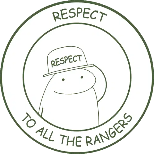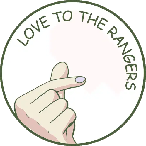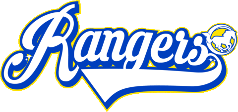 An animated logo for the Mustang Cheer Rangers team, featuring the word 'Rangers' in blue and white script with a yellow outline.