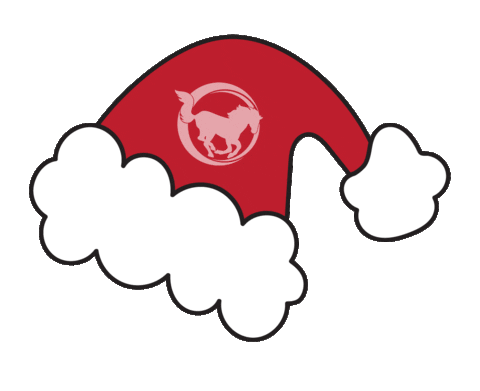 A festive red Santa hat featuring the iconic Mustang Cheer logo with a rearing horse, perfect for holiday spirit.