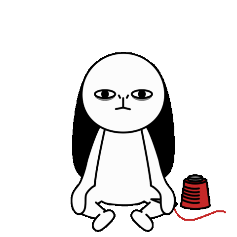 A minimalist cartoon character with long black hair, sitting silently with hands covering its mouth, next to a red thimble.