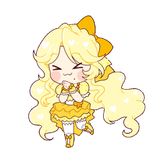 Magical Warrior Diamond Heart, Mwdh, in a cute chibi form, happily dancing with a big smile and heart details.