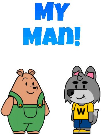 A friendly bear embraces a wolf, with "MY MAN!" text, showing strong camaraderie and affection between friends.