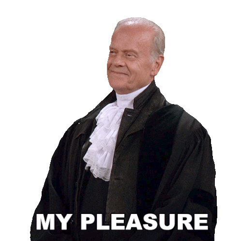 Dr. Frasier Crane, portrayed by Kelsey Grammer, smiles and nods, expressing "My Pleasure" in this animated sticker.