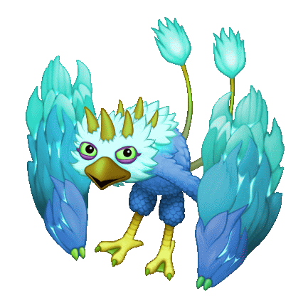a cartoon drawing of a bird with blue feathers and yellow claws