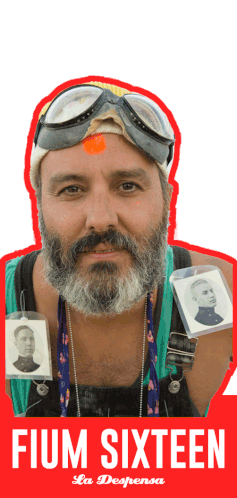 Miguel, the bearded man in overalls and goggles, displays photos and the text 'Fium Sixteen'.