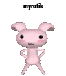 Myrotik, a cute pink bunny-like character, stands with hands on hips, striking a silly pose for this animated sticker.