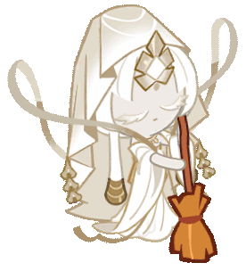 Mystic Flour Cookie from Cookie Run Kingdom, a white ethereal character, floats while holding a broom.