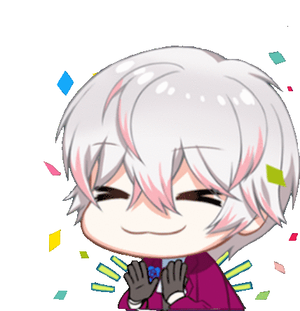 Mystic Messenger's Ray, in chibi form, claps happily as colorful confetti falls around him, celebrating with joy.