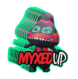 Animated sticker featuring the Myxedup Funguy character with 'MYXEDUP' text, a vibrant and energetic monster.