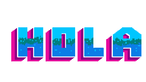 Nacho Nachugo presents a vibrant pixel art sticker featuring the word 'HOLA' with a cool water-like texture and 3D effect.