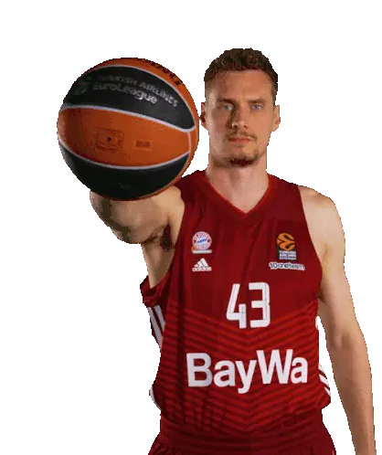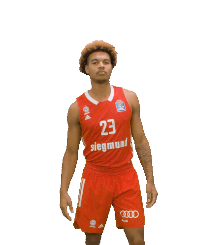 Martin Kalu, a young FC Bayern Basketball player, performs his signature bow and arrow celebration in his red jersey.