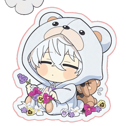 a cartoon of a girl in a teddy bear costume holding flowers and a teddy bear
