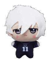 a stuffed doll with white hair and the number 11 on his jersey
