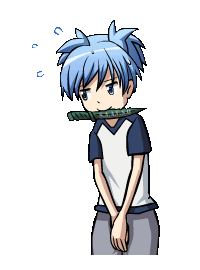 Nagisa Shiota, the blue-haired anime character, looks nervous with a green knife held in his mouth, sweat drops appearing above his head.