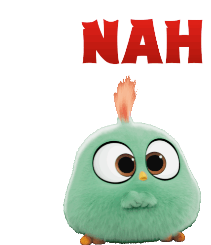 The cute Angry Birds hatchling character defiantly says 'Nah' or 'No', expressing refusal or disagreement.