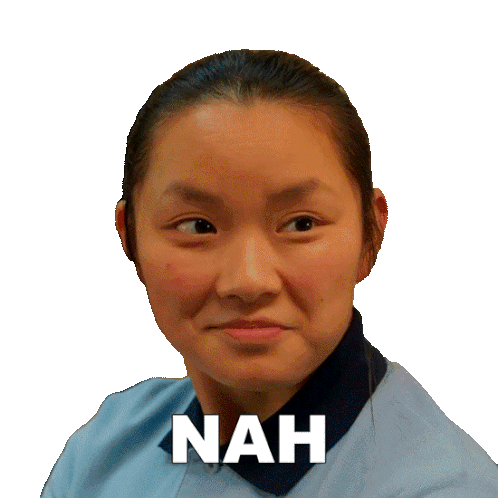 Vivian, a young woman, subtly shakes her head and gives a side-eye, with 'NAH' displayed, indicating refusal or disagreement.