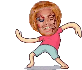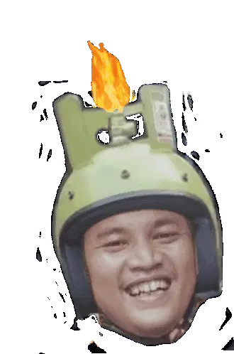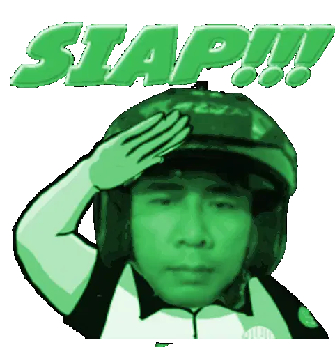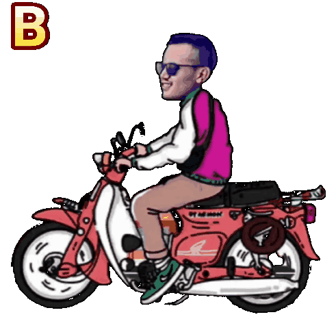 Animated sticker of Jarot riding a classic red Honda 70 motorcycle, with text changing from BUD to BUDA.