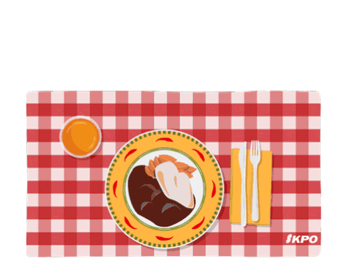 An animated sticker showing various meals being served, eaten, and cleared on a checkered tablecloth, representing hunger and mealtime.