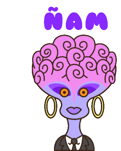 A purple alien character with a large brain and hoop earrings licks its lips, expressing 'Ñam' (yum).
