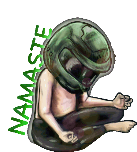 A person in a green sci-fi helmet meditates peacefully, with 'NAMASTE' glowing beside them, embodying inner peace.