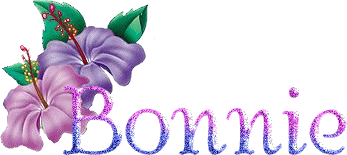 A glittery name plate sticker featuring the name Bonnie surrounded by purple flowers and green leaves.