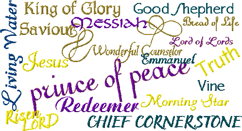 A vibrant sticker showcasing various names and titles for Jesus Christ, including 'Prince of Peace', 'Savior', and 'King of Glory'.