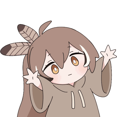 Nanashi Mumei, an anime character, raises her arms expectantly, asking "Where's my hug?" with a hopeful expression.