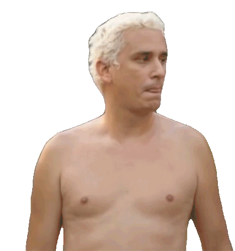 Rafael Portugal, shirtless with blonde hair, reacts with a "não" expression, sticking out his tongue slightly, conveying disagreement.