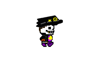 Naruto Rodolfo, a pixel art skeleton character with a hat and gold tooth, stands still with a glowing object.