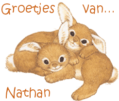 A sweet sticker featuring two adorable cuddling bunnies with the name Nathan and a 'Greetings From...' message.