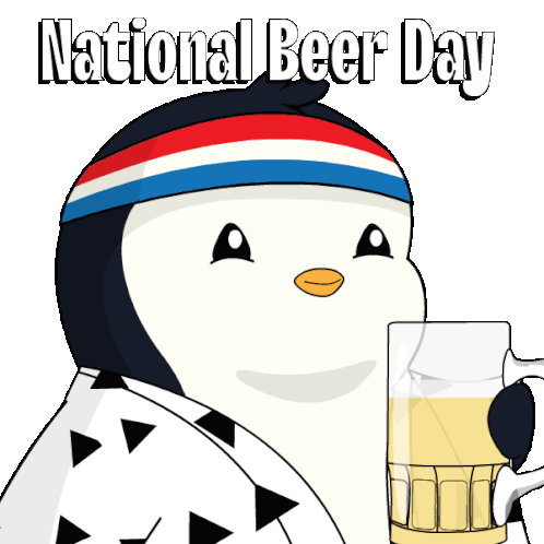 Pudgypenguins celebrates National Beer Day by chugging a mug of beer, wearing a festive headband.