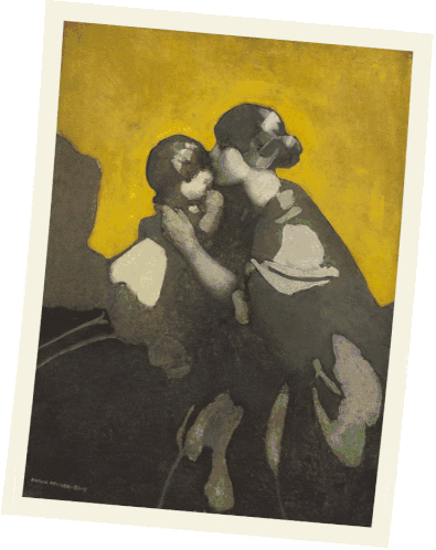 Norah Neilson Gray's iconic 'Mother and Child' painting from the National Galleries of Scotland, animated with shifting, vibrant colors.