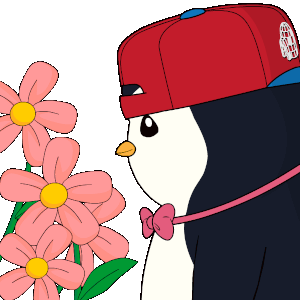 An adorable animated penguin, wearing a red cap and pink bow tie, happily smells a bouquet of fresh pink flowers.
