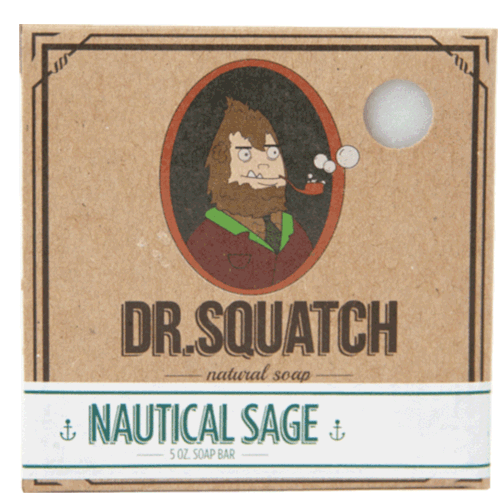A Dr. Squatch Nautical Sage natural soap bar box featuring a cartoon Bigfoot character smoking a pipe.