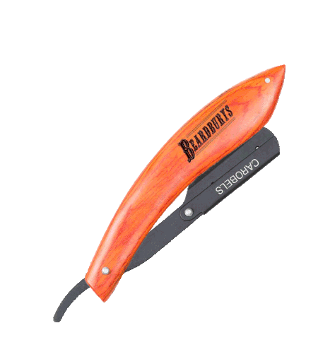 An animated sticker of a Beardburys straight razor, featuring a distinctive wooden handle and black blade.