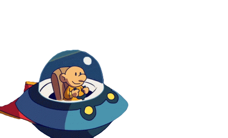 Un personaje animado pilota una nave espacial azul y roja, viajando por el espacio con una sonrisa.