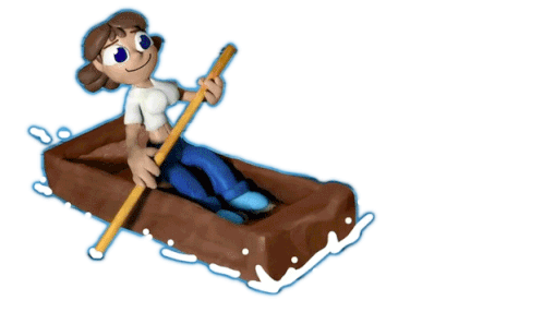 A charming claymation character, Navegar Curiosamente, is seen happily paddling a small brown boat with a yellow oar.