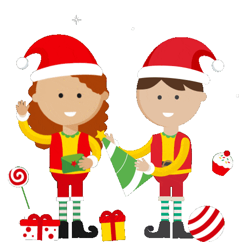 Two cheerful Christmas elves, one waving and the other decorating a tree, surrounded by festive gifts and sparkling stars.