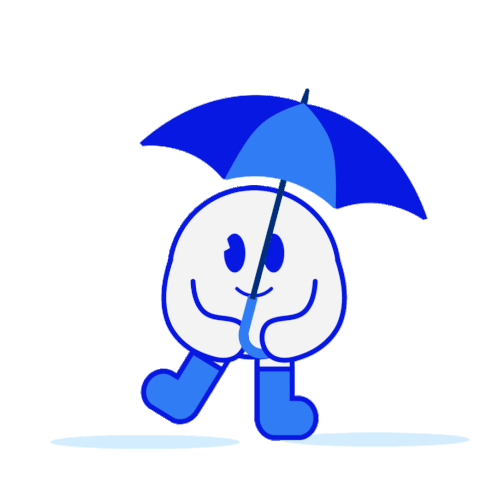 A cute cartoon character from Navy Rebrnd happily walks with a blue umbrella in the rain.