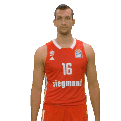 Paul Zipser, a basketball player, performs a 'brush shoulders' or 'dirt off your shoulder' gesture in his Bayern jersey.