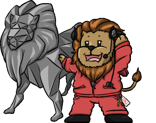 A cheerful lion mascot in a red jacket and headset celebrates alongside a geometric lion, representing the Ndp19 event.