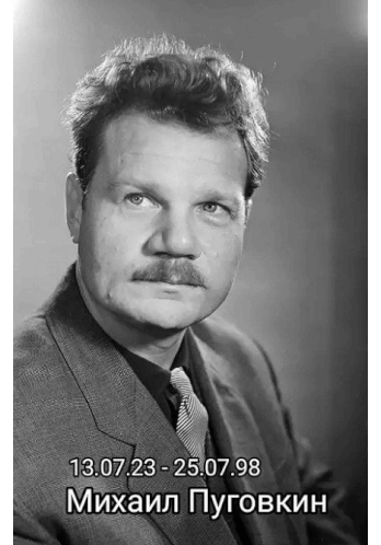 Memorial sticker for Soviet and Russian actor Mikhail Pugovkin (Миша), featuring his portrait and life dates: 13.07.1923 - 25.07.2008.