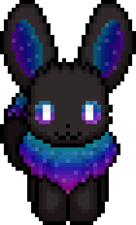 An animated pixel art sticker of a dark Eevee with nebula-themed blue and purple patterns on its ears, ruff, and eyes, blinking.