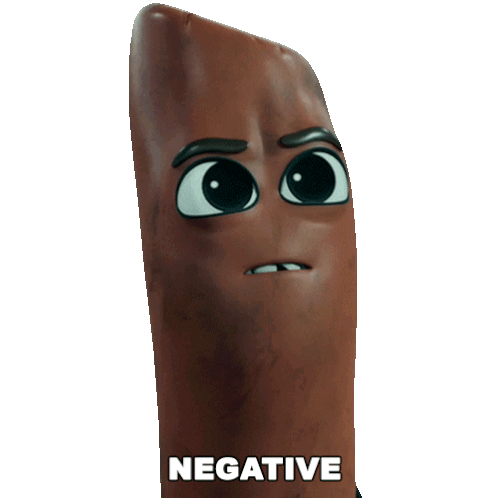 Barry, the cartoon sausage from Sausage Party Foodtopia, expresses a strong negative reaction with an angry face and the word 'NEGATIVE'.
