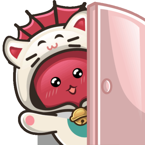 Neko Red Bean Azuki peeks happily from behind a pink door, wearing a cute cat costume.
