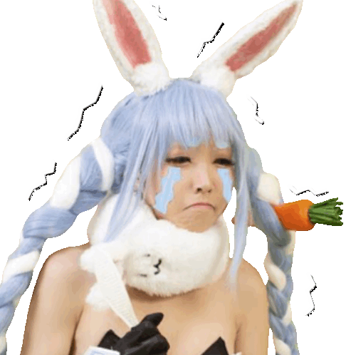 Usada Pekora cosplay with blue tears and a sad, pouting expression, trembling with emotion. Features Nekonoi Katsu.