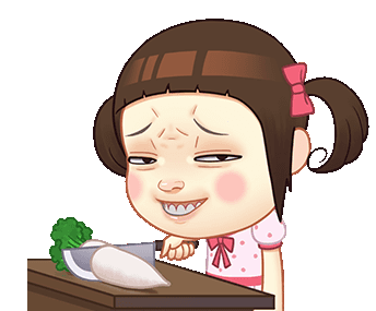 Neneng Gesrek with a cleaver in her head, smiling slyly at a radish on a table. Quirky and funny.