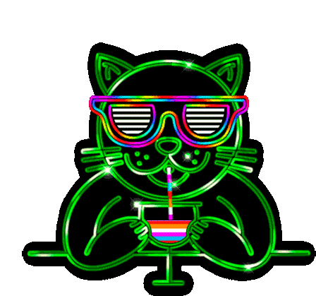 Omer's cool neon cat, a character from Omerismos, chills in rainbow sunglasses, sipping a colorful drink. Relaxing vibes.