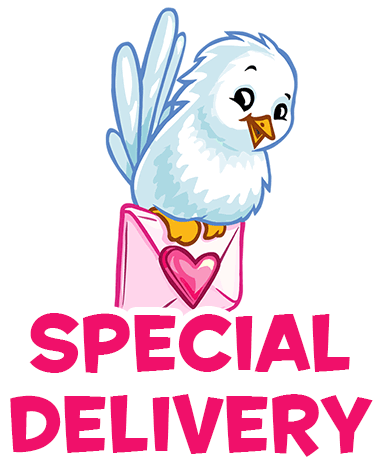 A cute Neopets Weewoo bird sits on a pink heart envelope, announcing a special delivery.