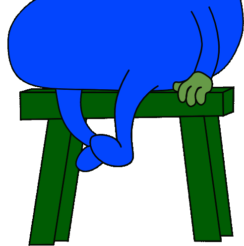 A blue Nerd Geek monster character sits on a green wooden bench, with its legs dangling.