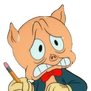 Porky Pig looks extremely nervous and anxious, sweating profusely while clutching a pencil. His eyes are wide with worry.